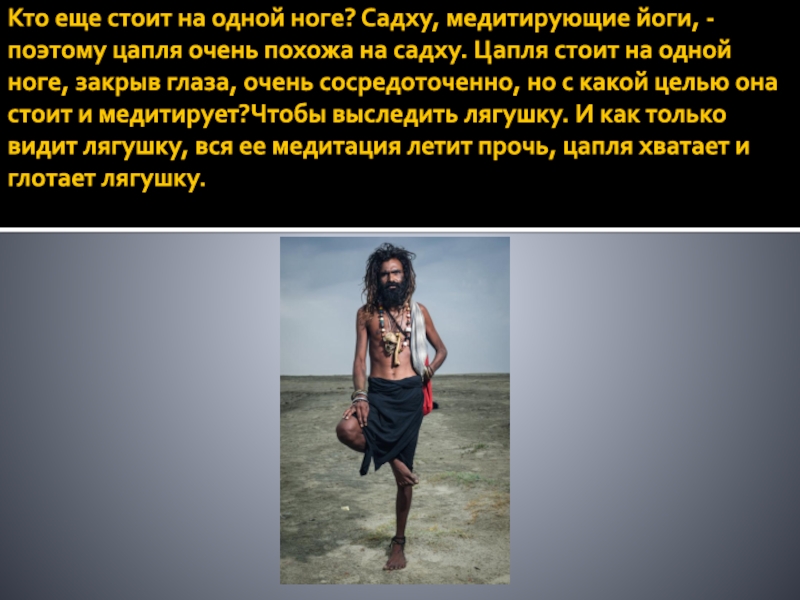 Слайд 3Кто еще стоит на одной ноге? Садху, медитирующие йоги, -
