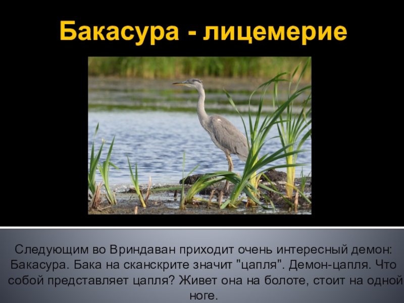 Бакасура - лицемериеСледующим во Вриндаван приходит очень интересный демон: Бакасура. Бака на сканскрите значит "цапля". Демон-цапля. Что собой представляет цапля? Живет она на болоте, стоит на одной ноге.