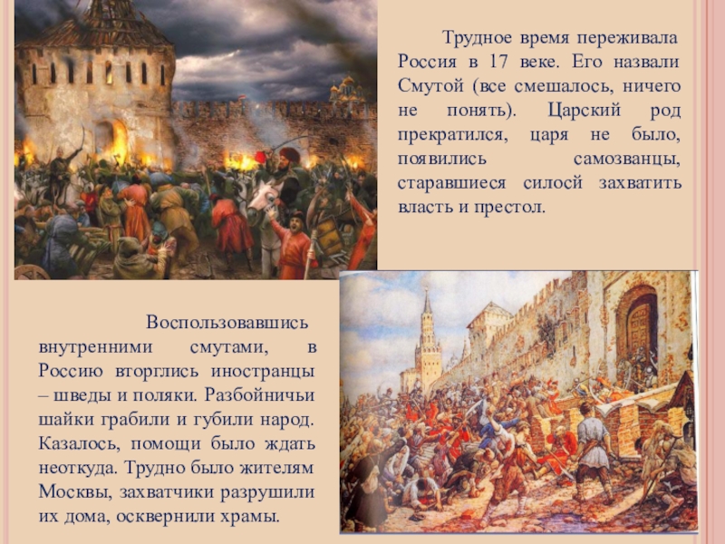 Воспользовавшись внутренними смутами, в Россию вторглись иностранцы – шведы и поляки. Разбойничьи шайки грабили и губили народ. Казалось, помощи было ждать неоткуда. Трудно было жителям Москвы, захватчики разрушили их дома, осквернили храмы.