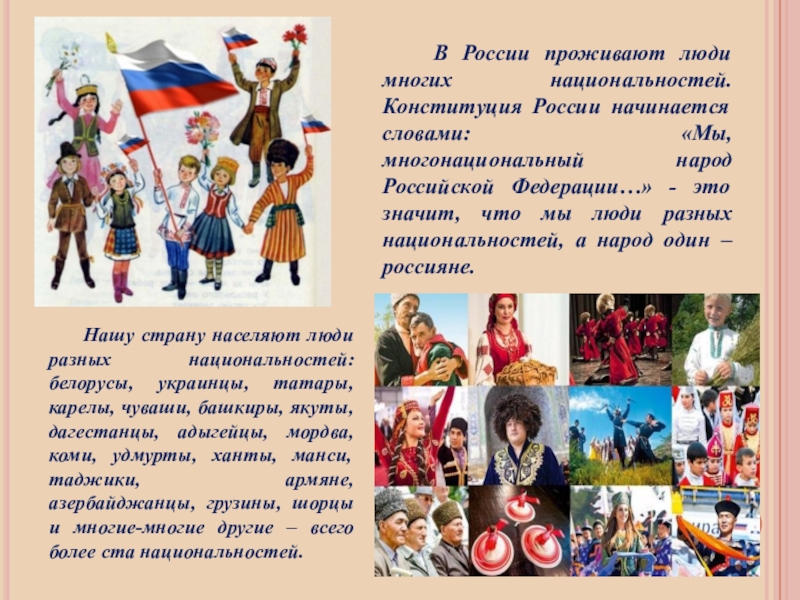 Нашу страну населяют люди разных национальностей: белорусы, украинцы, татары, карелы, чуваши, башкиры, якуты, дагестанцы, адыгейцы, мордва, коми, удмурты, ханты, манси, таджики, армяне, азербайджанцы, грузины, шорцы и многие-многие другие – всего более ста национальностей.