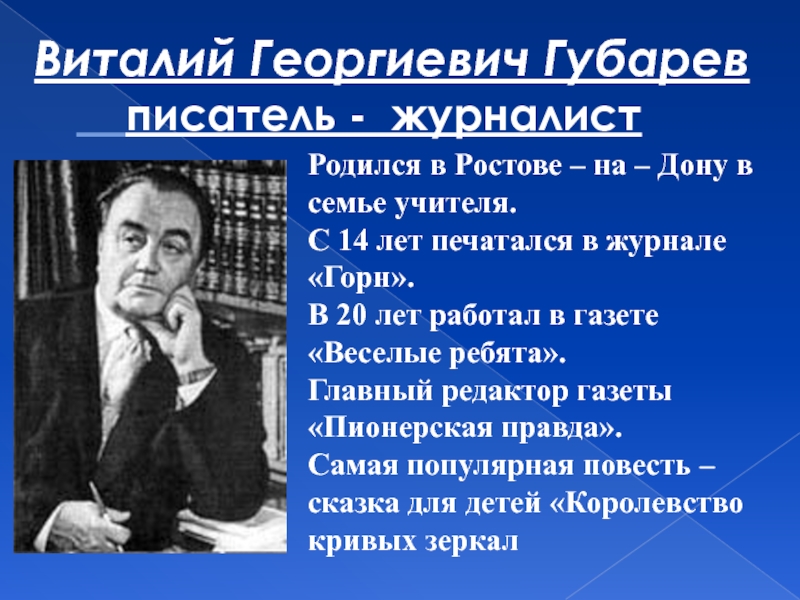 Виталий Георгиевич Губарев   писатель - журналистРодился в Ростове – на – Дону в семье учителя.