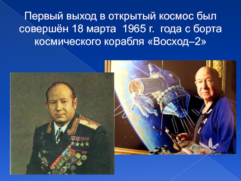 Первый выход в открытый космос был совершён 18 марта 1965 г.  года с борта космического корабля «Восход–2»