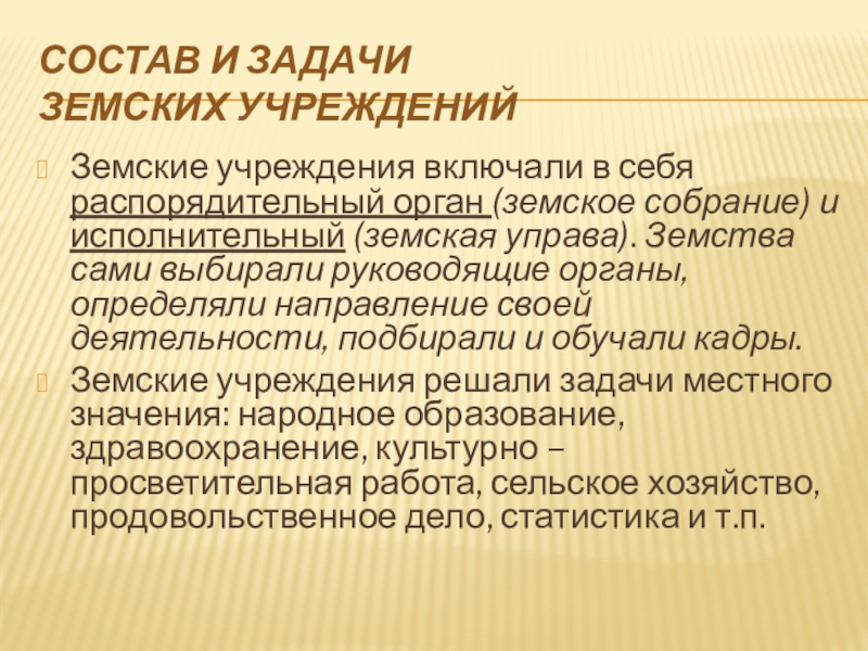 Земские учреждения решали задачи местного значения: народное образование, здравоохранение, культурно – просветительная работа, сельское хозяйство, продовольственное дело, статистика и т.п.