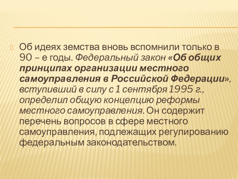 Российской Федерации», вступивший в силу с 1 сентября 1995 г., определил общую концепцию реформы местного самоуправления. Он содержит перечень вопросов в сфере местного самоуправления, подлежащих регулированию федеральным законодательством.