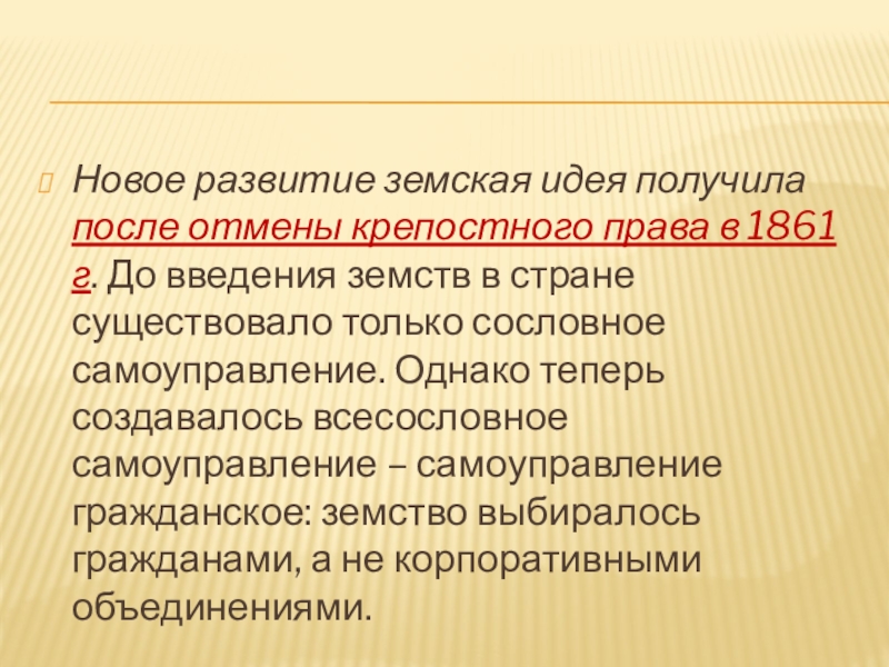 Слайд 7Новое развитие земская идея получила после отмены крепостного права в