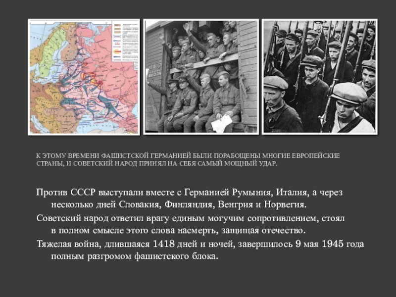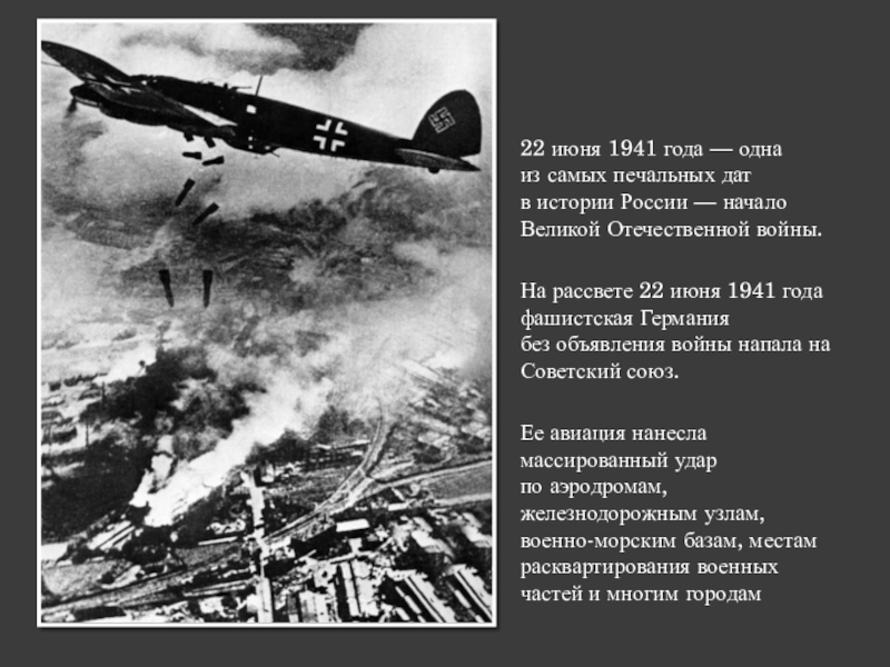 без объявления войны напала на Советский союз.Ее авиация нанесла массированный удар по аэродромам, железнодорожным узлам, военно-морским базам, местам расквартирования военных частей и многим городам