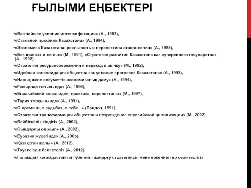 (М., 1991), «Стратегия развития Казахстана как суверенного государства» (А., 1992),