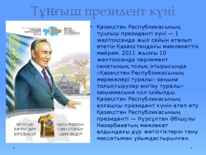 1991 ж. желтоқсанның 1-інде тұңғыш рет Қазақстан Республикасы Президентінің жалпыхалықтық сайлауы өтті. Сайлау нәтижесінде Нұрсұлтан Әбішұлы Назарбаев басым дауыспен (98,78 %) жеңіске жетті.