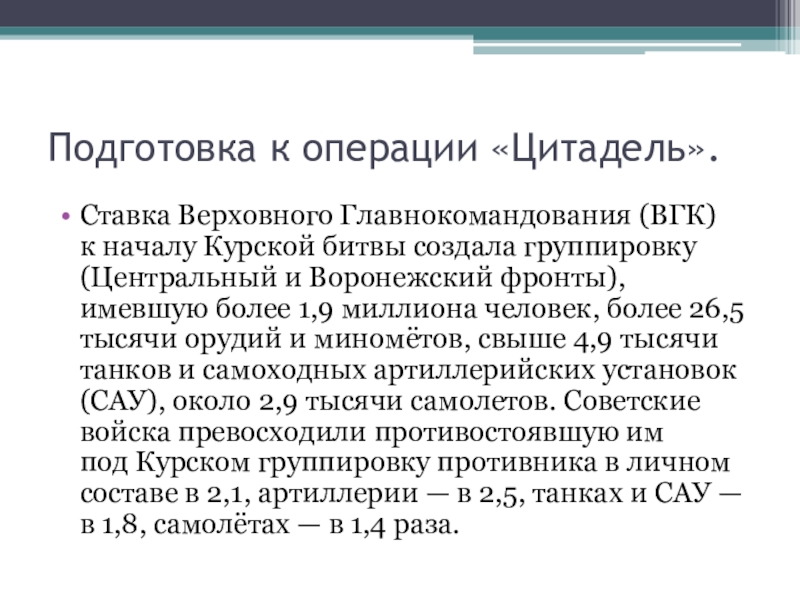 26,5 тысячи орудий и миномётов, свыше 4,9 тысячи танков и самоходных артиллерийских установок (САУ), около 2,9 тысячи самолетов. Советские войска превосходили противостоявшую им под Курском группировку противника в личном составе в 2,1, артиллерии — в 2,5, танках и САУ — в 1,8, самолётах — в 1,4 раза.
