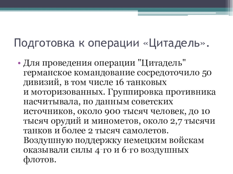советских источников, около 900 тысяч человек, до 10 тысяч орудий и минометов, около 2,7 тысячи танков и более 2 тысяч самолетов. Воздушную поддержку немецким войскам оказывали силы 4‑го и 6‑го воздушных флотов.
