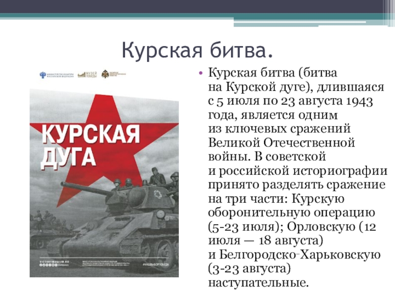 В советской и российской историографии принято разделять сражение на три части: Курскую оборонительную операцию (5-23 июля); Орловскую (12 июля — 18 августа) и Белгородско‑Харьковскую (3-23 августа) наступательные.