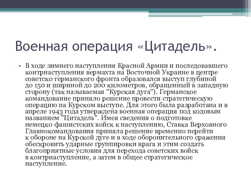 и шириной до 200 километров, обращенный в западную сторону (так называемая "Курская дуга"). Германское командование приняло решение провести стратегическую операцию на Курском выступе. Для этого была разработана и в апреле 1943 года утверждена военная операция под кодовым названием "Цитадель". Имея сведения о подготовке немецко‑фашистских войск к наступлению, Ставка Верховного Главнокомандования приняла решение временно перейти к обороне на Курской дуге и в ходе оборонительного сражения обескровить ударные группировки врага и этим создать благоприятные условия для перехода советских войск в контрнаступление, а затем в общее стратегическое наступление.
