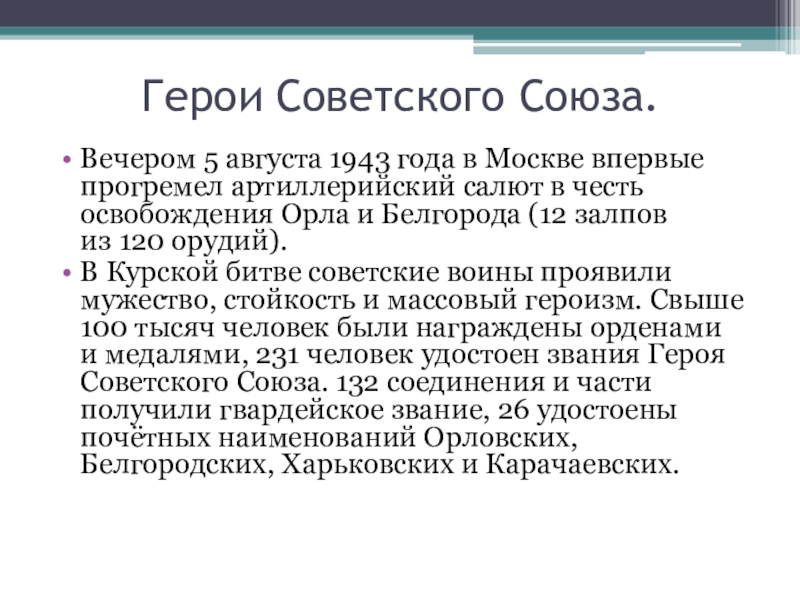 Курской битве советские воины проявили мужество, стойкость и массовый героизм. Свыше 100 тысяч человек были награждены орденами и медалями, 231 человек удостоен звания Героя Советского Союза. 132 соединения и части получили гвардейское звание, 26 удостоены почётных наименований Орловских, Белгородских, Харьковских и Карачаевских.