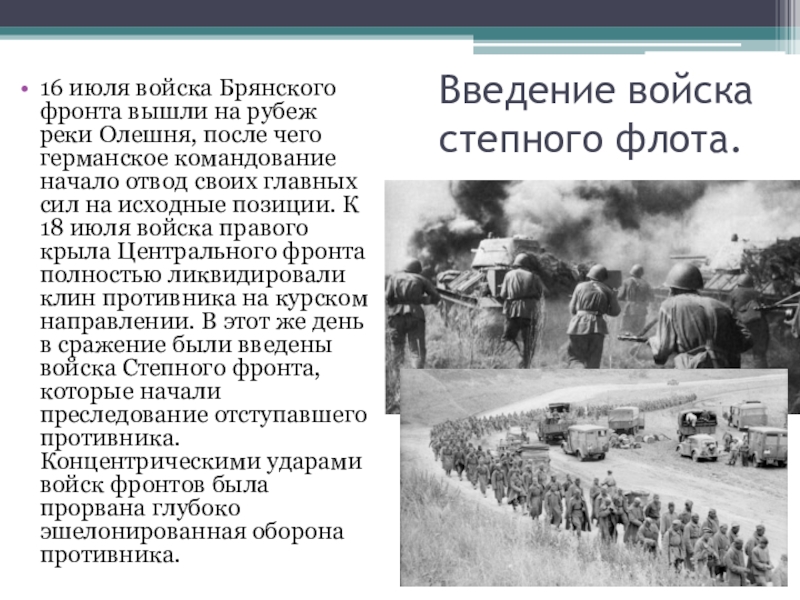 сил на исходные позиции. К 18 июля войска правого крыла Центрального фронта полностью ликвидировали клин противника на курском направлении. В этот же день в сражение были введены войска Степного фронта, которые начали преследование отступавшего противника. Концентрическими ударами войск фронтов была прорвана глубоко эшелонированная оборона противника.