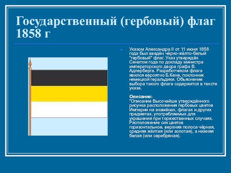 "Описание Высочайше утверждённого рисунка расположения гербовых цветов Империи на знамёнах, флагах и других предметах, употребляемых для украшения при торжественных случаях. Расположение сих цветов горизонтальное, верхняя полоса чёрная, средняя жёлтая (или золотая), а нижняя белая (или серебряная).