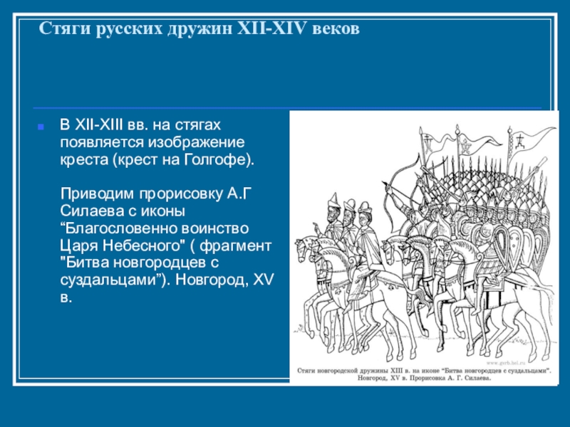 конце, к которому пришивались кисти на конце. Такая форма стягов вместе с "двузубцем" - знаком-гербом великого князя Святослава прочерчивалась на арабских дирхемах X в., имевшая хождение на территории Древней Руси.