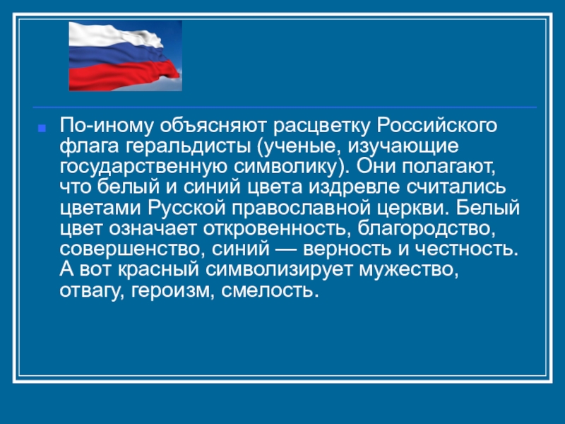 Слайд 7По-иному объясняют расцветку Российского флага геральдисты (ученые, изучающие государственную символику).