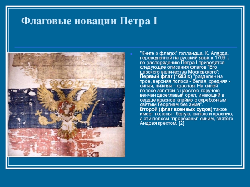Первый флаг (1693 г.) "разделен на трое, верхняя полоса - белая, средняя - синяя, нижняя - красная. На синей полосе золотой с царскою коруною венчан двоеглавый орел, имеющий в сердце красное клеймо с серебряным святым Георгием без змия".