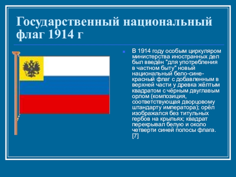 новый национальный бело-сине-красный флаг с добавленным в верхней части у древка жёлтым квадратом с чёрным двуглавым орлом (композиция, соответствующая дворцовому штандарту императора); орёл изображался без титульных гербов на крыльях; квадрат перекрывал белую и около четверти синей полосы флага. [7]