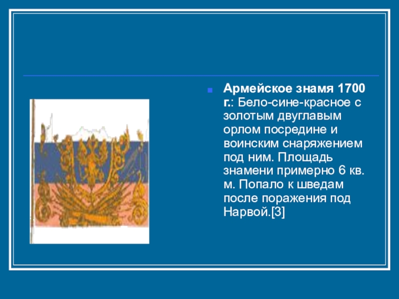 Слайд 15Армейское знамя 1700 г.: Бело-сине-красное с золотым двуглавым орлом посредине