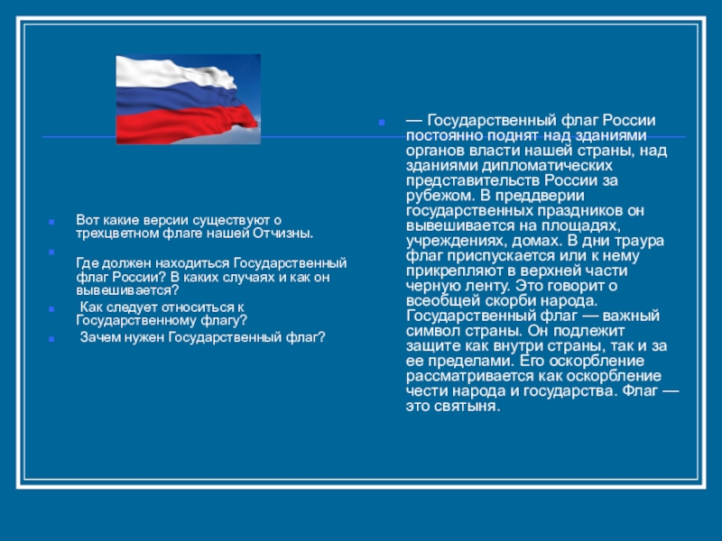 — Государственный флаг России постоянно поднят над зданиями органов власти нашей страны, над зданиями дипломатических представительств России за рубежом. В преддверии государственных праздников он вывешивается на площадях, учреждениях, домах. В дни траура флаг приспускается или к нему прикрепляют в верхней части черную ленту. Это говорит о всеобщей скорби народа.