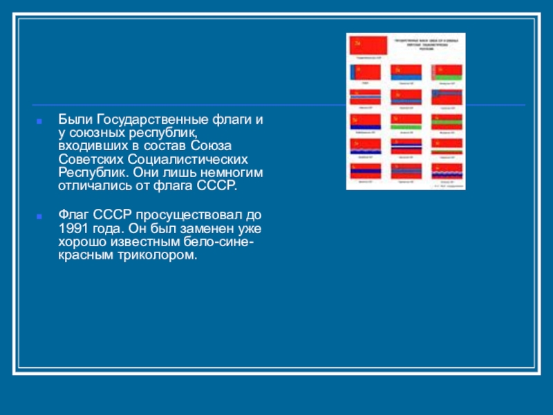 Слайд 23Были Государственные флаги и у союзных республик, входивших в состав