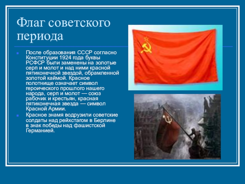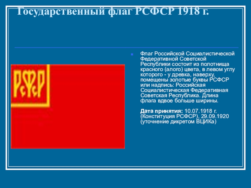 - у древка, наверху, помещены золотые буквы РСФСР или надпись: Российская Социалистическая Федеративная Советская Республика. Длина флага вдвое больше ширины.