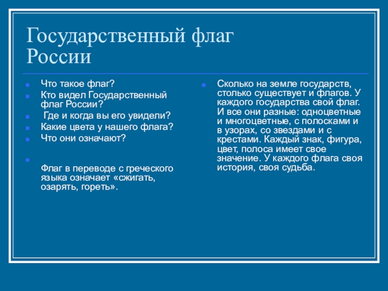 Сколько на земле государств, столько существует и флагов. У каждого государства свой флаг. И все они разные: одноцветные и многоцветные, с полосками и в узорах, со звездами и с крестами. Каждый знак, фигура, цвет, полоса имеет свое значение. У каждого флага своя история, своя судьба.