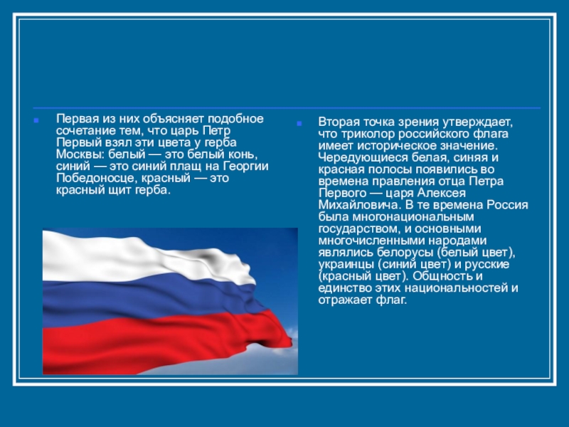 Вторая точка зрения утверждает, что триколор российского флага имеет историческое значение. Чередующиеся белая, синяя и красная полосы появились во времена правления отца Петра Первого — царя Алексея Михайловича. В те времена Россия была многонациональным государством, и основными многочисленными народами являлись белорусы (белый цвет), украинцы (синий цвет) и русские (красный цвет). Общность и единство этих национальностей и отражает флаг.