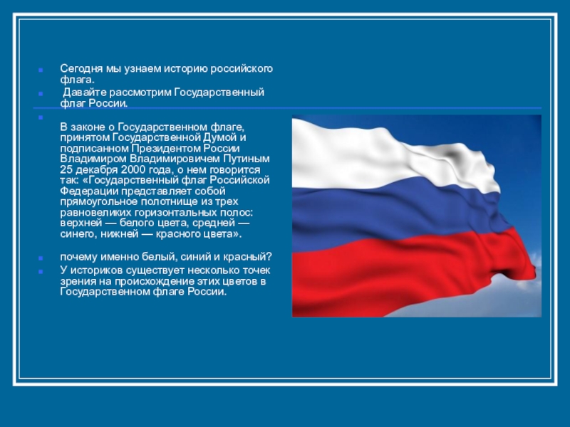 Президентом России Владимиром Владимировичем Путиным 25 декабря 2000 года, о нем говорится так: «Государственный флаг Российской Федерации представляет собой прямоугольное полотнище из трех равновеликих горизонтальных полос: верхней — белого цвета, средней — синего, нижней — красного цвета».