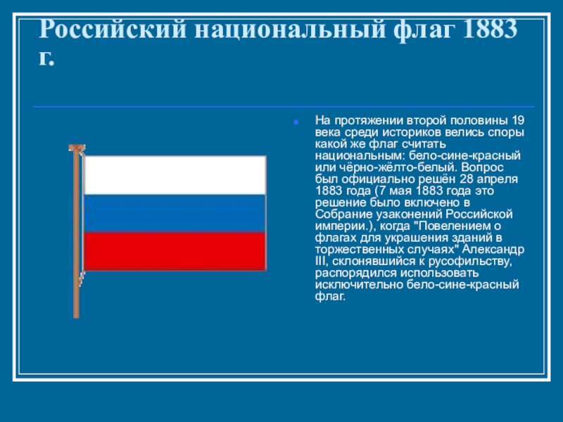 или чёрно-жёлто-белый. Вопрос был официально решён 28 апреля 1883 года (7 мая 1883 года это решение было включено в Собрание узаконений Российской империи.), когда "Повелением о флагах для украшения зданий в торжественных случаях" Александр III, склонявшийся к русофильству, распорядился использовать исключительно бело-сине-красный флаг.