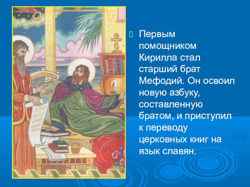 Слайд 7Первым помощником Кирилла стал старший брат Мефодий. Он освоил новую