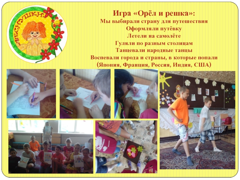 Игра «Орёл и решка»:Мы выбирали страну для путешествияОформляли путёвкуЛетели на самолётеГуляли по разным столицамТанцевали народные танцыВоспевали города