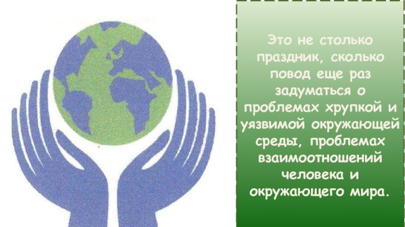 Это не столько праздник, сколько повод еще раз задуматься о проблемах хрупкой и уязвимой окружающей среды, проблемах