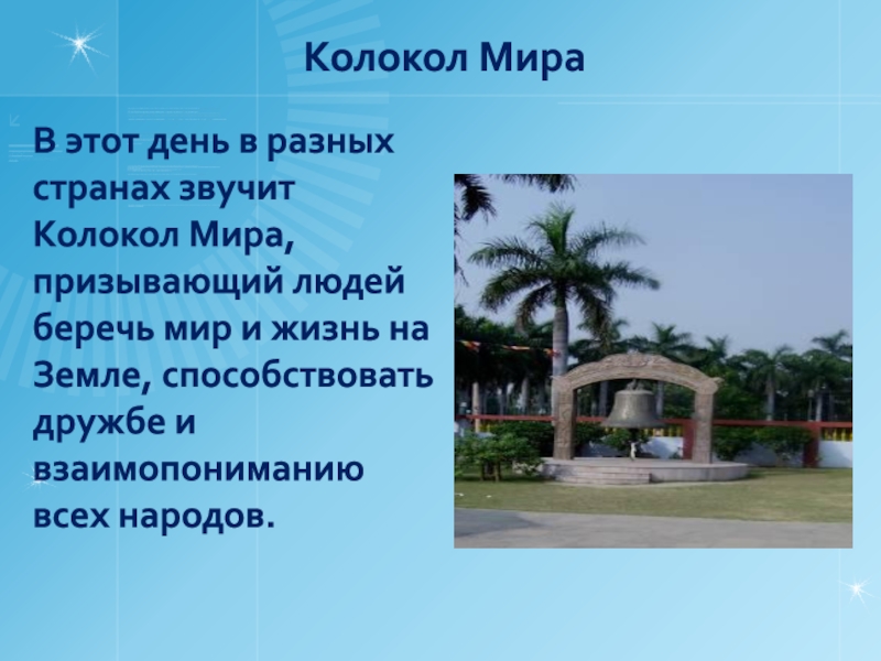 Колокол МираВ этот день в разных странах звучит Колокол Мира, призывающий людей беречь мир и жизнь на