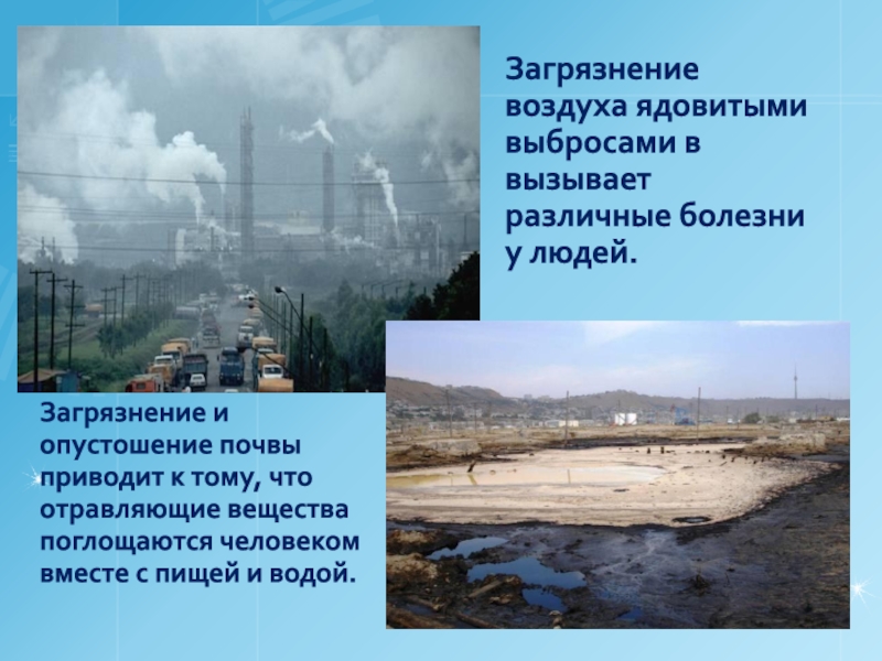 Загрязнение воздуха ядовитыми выбросами в вызывает различные болезни у людей.Загрязнение и опустошение почвы приводит к тому, что