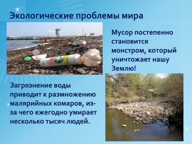 Экологические проблемы мираМусор постепенно становится монстром, который уничтожает нашу Землю!Загрязнение воды приводит к размножению малярийных комаров, из-за