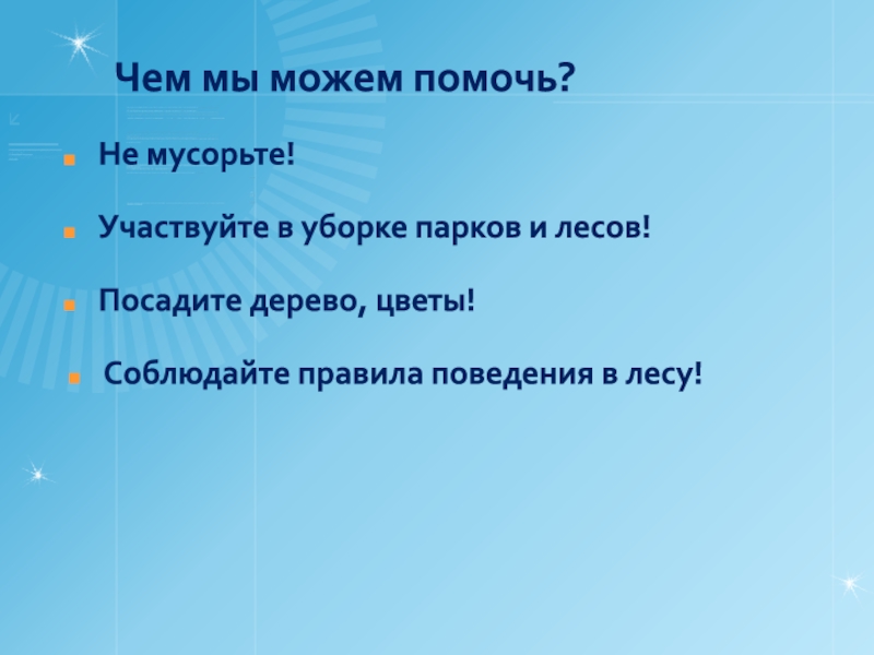 Чем мы можем помочь?Не мусорьте! Участвуйте в уборке парков и лесов! Посадите дерево, цветы! Соблюдайте правила поведения