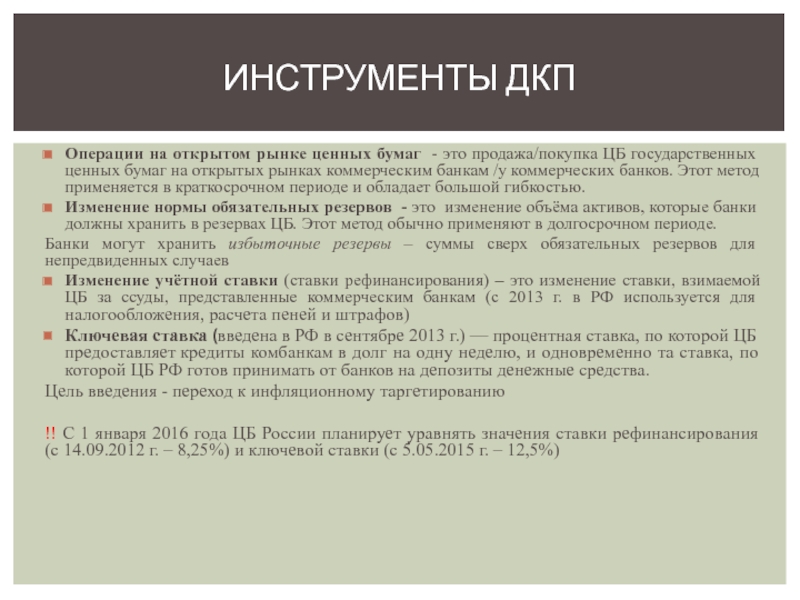 !! С 1 января 2016 года ЦБ России планирует уравнять значения ставки рефинансирования (с 14.09.2012 г. – 8,25%) и ключевой ставки (с 5.05.2015 г. – 12,5%)