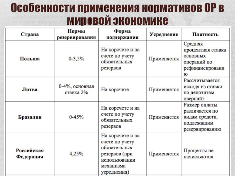 Слайд 20Особенности применения нормативов ОР в мировой экономике