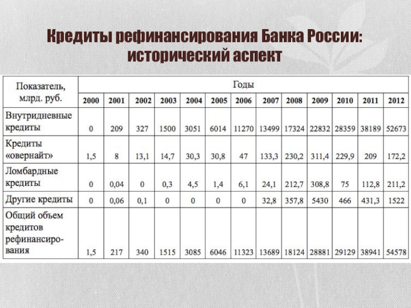 Слайд 23Кредиты рефинансирования Банка России: исторический аспект