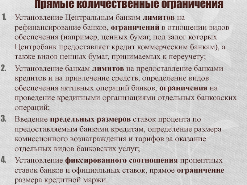 и операций самого Центробанка; это установление лимитов на рефинансирование кредитных организаций и проведение кредитными организациями отдельных банковских операций.