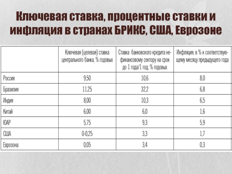 Слайд 12Ключевая ставка, процентные ставки и инфляция в странах БРИКС, США,