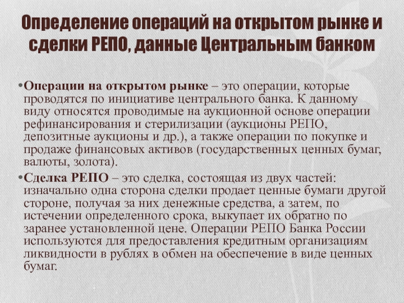 Слайд 25Определение операций на открытом рынке и сделки РЕПО, данные Центральным