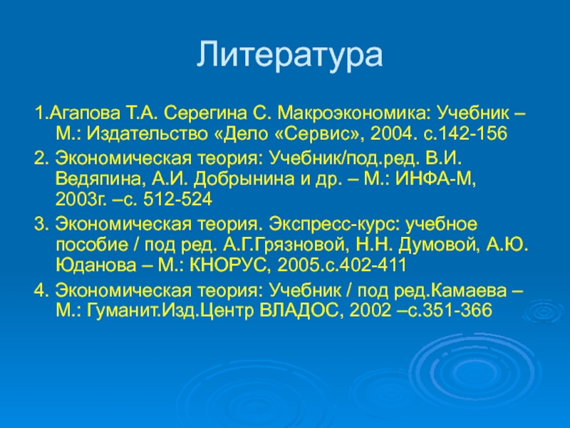 1.Агапова Т.А. Серегина С. Макроэкономика: Учебник –М.: Издательство «Дело «Сервис»,