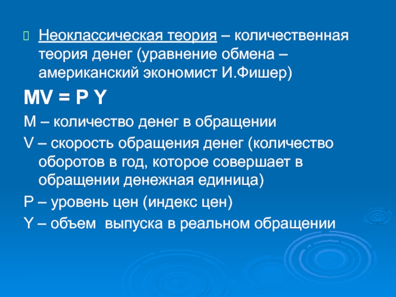Слайд 14Неоклассическая теория – количественная теория денег (уравнение обмена – американский