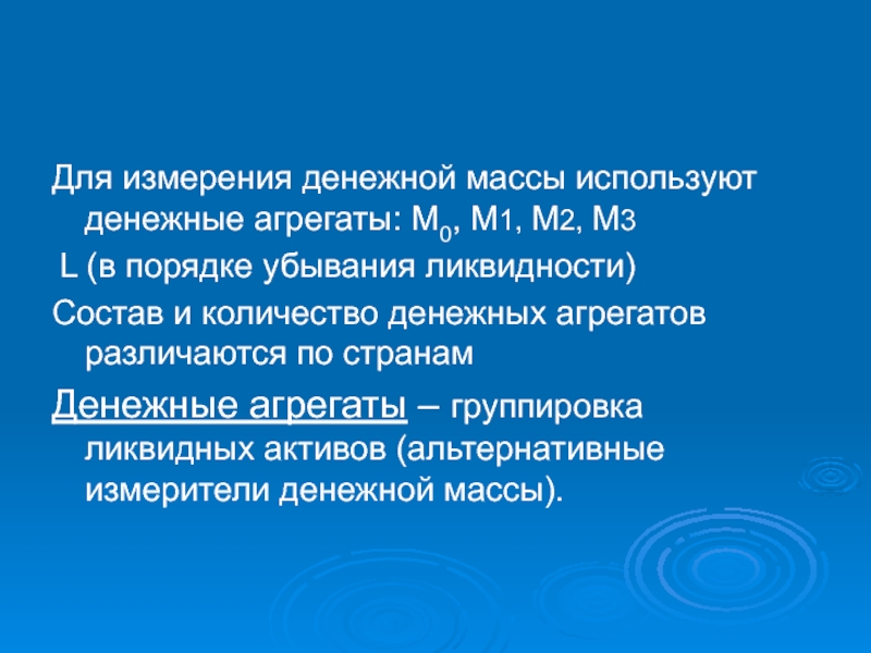 Слайд 10Для измерения денежной массы используют денежные агрегаты: М0, М1, М2,
