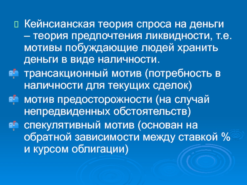 Слайд 18Кейнсианская теория спроса на деньги – теория предпочтения ликвидности, т.е.