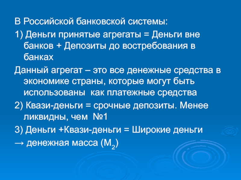 M2 = M1 + не чековые сберегательные депозиты; срочные вклады (до 100 тыс. дол.).Деньги в широком смысле