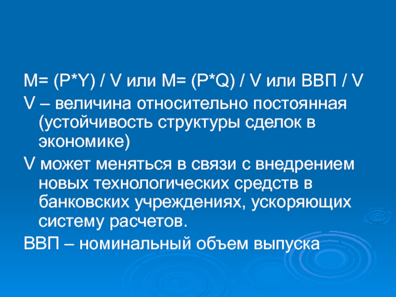 V может меняться в связи с внедрением новых технологических средств в банковских учреждениях, ускоряющих систему расчетов.